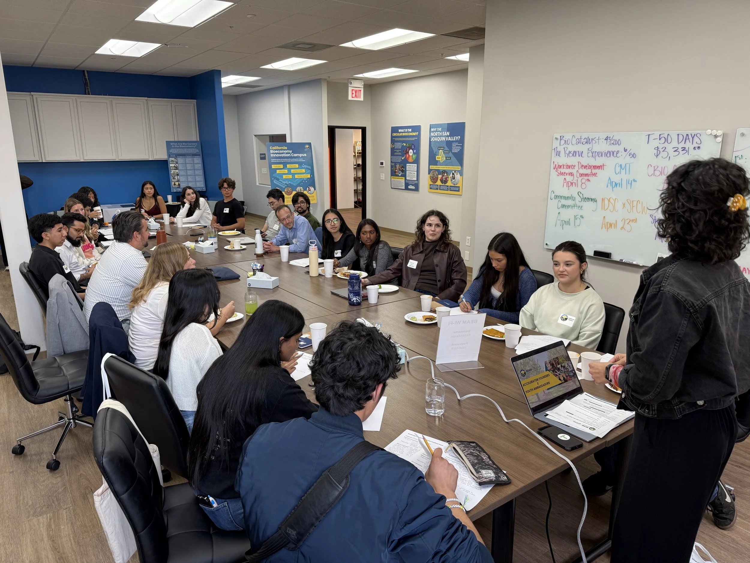 Youth Ambassadors meet with start-up founders at the BEAM Circular office in Modesto.